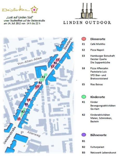 Der DeisterKiez e.V. nimmt gern die Fackel auf, die der „Netzwerk Lebenskunst e.V.“ im vergangenen Jahr mit dem „Dinner zur Deisterstunde“ so erfolgreich leuchten ließ. Es soll eine großes gemeinsames Stadtteilfest: „Lust auf Linden Süd“ auf der autofreien Deister-straße veranstaltet werden. Seit Herbst des vergangenen Jahres ist in alle Foren des Stadtteils ein gemeinsamer Wille gewachsen. In fünf Sitzungen hat ein Kulturrat getagt und die inhaltliche und ökonomische Ausrichtung des Festes erörtert.