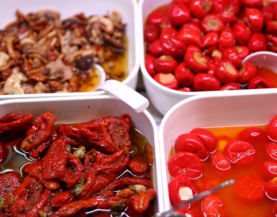 Große Auswahl an leckerer Antipasti wie eingelegte und getrocknete Tomaten