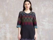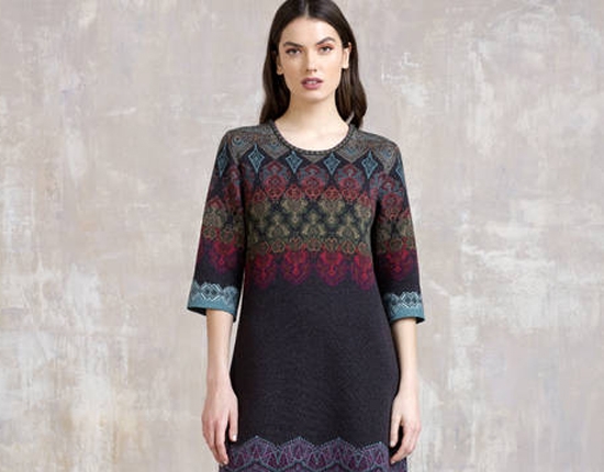Dunkles Kleid mit farbigem Muster und 3/4-Ärmeln.