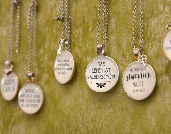 Verschiedene Ketten mit größeren Anhängern mit süßen Sprüchen.