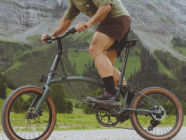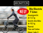 Das Brompton Faltrad fahrbereit mit 6-Gang-Schaltung, Nabendynamo-Lichtanlage, Gepäckträger und Schutzblechen. 12:58:00