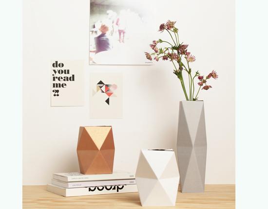 - zusammenfalten - Flasche oder Glas mit Wasser füllen - Blume rein - fertig! Die geometrischen Pappvasen sind von snug.studio aus Hannover und made in Germany!
