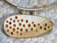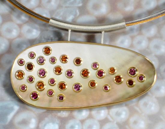 Auf einer ovalen, von einem goldenen Rahmen geschützten Perlmuttfläche schwimmen glitzernde Granatedelsteine. Ein zeitloser Anhänger, der durch eine entfernbare Aufhängung zur Brosche verändert werden kann.