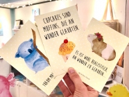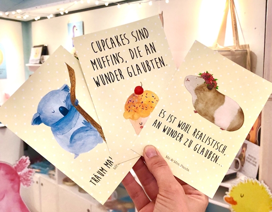 Süße Postkarten mit Sprüchen und Illustrationen.