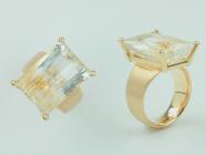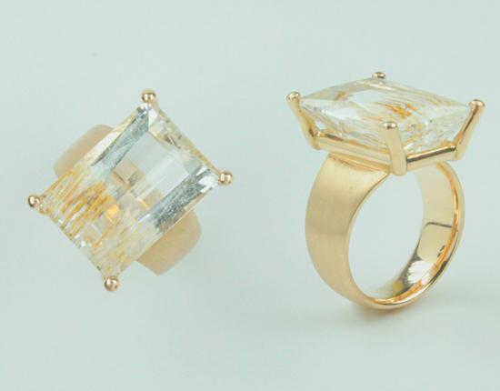 Durch die minimalistische Fassung des interessanten Rutilquarzes trifft ungehindert Licht auf den Edelstein. Die Trägerin des Goldringes kann ihn von allen Seiten genießen.