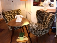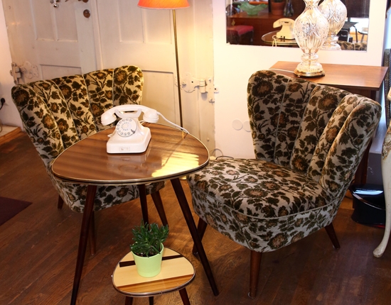 Gemütliche Sessel in Blumenmuster mit passenden Tischen.